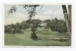 Amelia Holmes inherited $2,000 in 1848, and she and her husband used the money to build a summer house in Pittsfield, Massachusetts. Beginning in July 1849, the family spent "seven blessed summers" there.[79] Having recently given up his private medical practice, Holmes was able to socialize with other literary figures who spent time in The Berkshires; in August 1850, for example, Holmes spent time with Evert Augustus Duyckinck, Cornelius Mathews, Herman Melville, James T. Fields and Nathaniel Hawthorne.[80] Holmes enjoyed measuring the circumference of trees on his property and kept track of the data, writing that he had "a most intense, passionate fondness for trees in general, and have had several romantic attachments to certain trees in particular".[81] The high cost of maintaining their home in Pittsfield caused the Holmes family to sell it in May 1856.[79]