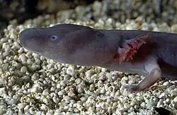 Although blind, the olm swims away from light.[8] The eyes are regressed, but retain sensitivity. They lie deep below the dermis of the skin and are rarely visible except in some younger adults. Larvae have normal eyes, but development soon stops and they start regressing, finally atrophying after four months of development.[20] The pineal body also has photoreceptive cells which, though regressed, retain visual pigment like the photoreceptive cells of the regressed eye. The pineal gland in Proteus probably possesses some control over the physiological processes.[21] Behavioral experiments revealed that the skin itself is also sensitive to light.[22] Photosensitivity of the integument is due to the pigment melanopsin inside specialized cells called melanophores. Preliminary immunocytochemical analyses support the existence of photosensitive pigment also in the animal's integument.[23][24]
