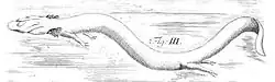 The olm's body is snakelike, 20–30 cm (8–12 in) long, with some specimens reaching up to 40 centimetres (16 in), which makes them some of the largest cave-dwelling animals in the world.[13][14] The average length is between 23 and 25 cm.[15] Females grow larger than males, but otherwise the primary external difference between the sexes is in the cloaca region (shape and size) when breeding.[4] The trunk is cylindrical, uniformly thick, and segmented with regularly spaced furrows at the myomere borders. The tail is relatively short, laterally flattened, and surrounded by a thin fin. The limbs are small and thin, with a reduced number of digits compared to other amphibians: the front legs have three digits instead of the normal four, and the rear have two digits instead of five. Its body is covered by a thin layer of skin, which contains very little of the pigment riboflavin,[16] making it yellowish-white or pink in color.[5]