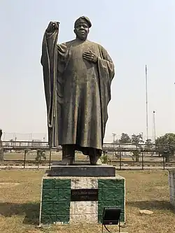 Olusegun was from the Owu Kingdom. He was raised a Baptist. His sister later converted to Islam inorder to marry a Muslim man.[9] At eleven, he joined the village primary school,[10] and after three years, in 1951, he moved on to the Baptist Day School in Abeokuta's Owu quarter.[11] In 1952 he transferred to the Baptist Boys' High School,[12] also in the town. His school fees were partly financed by state grants.[13] Obasanjo did well academically,[14] and at school became a keen Boy Scout.[15] Although there is no evidence that he was then involved in any political groups,[15] it was at secondary school that Obasanjo rejected his forename of "Matthew" as an anti-colonial act.[16]