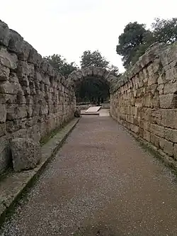 6. ^ An alternative view is that the stadium began inside the Altis but was moved outside: "The Stadium and the Events". A Tour of Ancient Olympia. Perseus Digital Library. Archived from the original on 14 July 2021. Retrieved 14 July 2021.. During its inside phase the spectators must have sat on the hill. In addition to disrespecting Pindar, this view requires a distance of about 100 m (330 ft) between the spectators and the events, a disadvantage easily seen from the current road on the hill, the steep cliff of the hill also being a disadvantage.