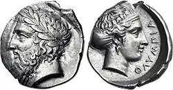 Silver Tetradrachm from Olympia, 360 BC. Obverse: Head of Zeus wearing laurel wreath. Reverse: Head of the nymph Olympia wearing sphendone. ΟΛΥΜΠΙΑ to right.