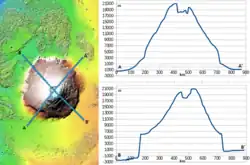 Being a shield volcano, Olympus Mons has a very gently sloping profile. The average slope on the volcano's flanks is only 5%.[16] Slopes are steepest near the middle part of the flanks and grow shallower toward the base, giving the flanks a concave upward profile. Its flanks are shallower and extend farther from the summit in the northwestern direction than they do to the southeast. The volcano's shape and profile have been likened to a "circus tent" held up by a single pole that is shifted off center.[20]