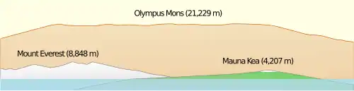 Olympus Mons (/əˌlɪmpəs ˈmɒnz, oʊ-/;[4] Latin for 'Mount Olympus') is a large shield volcano on Mars. It is over 21.9 km (13.6 mi; 72,000 ft) high as measured by the Mars Orbiter Laser Altimeter (MOLA),[5] about 2.5 times the elevation of Mount Everest above sea level. It is Mars's tallest volcano, its tallest planetary mountain, and is approximately tied with Rheasilvia on Vesta as the tallest mountain currently discovered in the Solar System. It is associated with the volcanic region of Tharsis Montes.[6][7][8] It last erupted 25 million years ago.[9]
