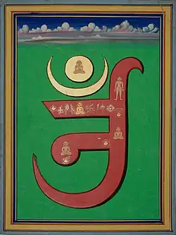 In Southeast Asia, the Om symbol is widely conflated with that of the unalome; originally a representation of the Buddha's urna curl and later a symbol of the path to nirvana, it is a popular yantra in Southeast Asia, particularly in Cambodia and Thailand. It frequently appears in sak yant religious tattoos, and has been a part of various flags and official emblems such as in the Thong Chom Klao of King Rama IV (r. 1851–1868)[50] and the present-day royal arms of Cambodia.[51]