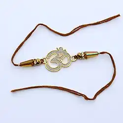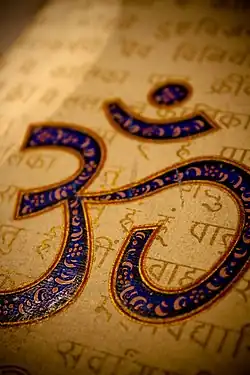 Om (or Aum; ⓘ; Sanskrit: ॐ, ओम्, romanized: Oṃ, Auṃ, ISO 15919: Ōṁ) is a polysemous symbol representing a sacred sound, seed syllable, mantra, and invocation in Hinduism as well as in other Indian religions.[1][2] Its written form is the most important symbol in the Hindu religion.[3] It is the essence of the supreme Absolute,[2] consciousness,[4][5][6] Ātman, Brahman, or the cosmic world.[7][8][9] In Indian religions, Om serves as a sonic representation of the divine, a standard of Vedic authority and a central aspect of soteriological doctrines and practices.[10] It is the basic tool for meditation in the yogic path to liberation.[11] The syllable is often found at the beginning and the end of chapters in the Vedas, the Upanishads, and other Hindu texts.[9] It is described as the goal of all the Vedas.[12]