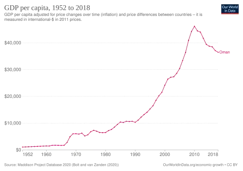 Oman's oil reserves are ranked as the 22nd largest globally.[11][16] In 2010, the United Nations Development Programme recognised Oman as the most improved country in the world in terms of development during the preceding 40 years.[17] Less reliant on fossil fuels than other Persian Gulf states, a significant portion of Oman's economy involves tourism, as well as the trade of fish, dates and other agricultural produce. The World Bank classifies Oman as a high-income economy. As of 2024, Oman ranks as the 42nd most peaceful country in the world in the Global Peace Index,[18] and the most peaceful Arab state after Qatar and Kuwait.