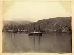 In 1854, a deed of cession of the Omani Kuria Muria islands to Britain was signed by the sultan of Muscat and the British government.[79] The British government achieved predominating control over Muscat, which, for the most part, impeded competition from other nations.[80] Between 1862 and 1892, the Political Residents, Lewis Pelly and Edward Ross, played an instrumental role in securing British supremacy over the Persian Gulf and Muscat by a system of indirect governance.[73] By the end of the 19th century, and with the loss of its African dominions and its revenues, British influence increased to the point that the sultans became heavily dependent on British loans and signed declarations to consult the British government on all important matters.[75][81][82][83] The Sultanate thus came de facto under the British sphere.[82][84]