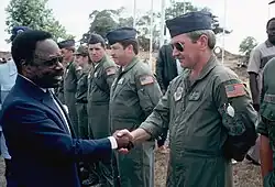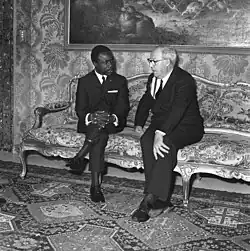 Bongo began his political career after Gabon's independence in 1960, rapidly rising through a succession of positions under President Léon M'ba.[13] Bongo campaigned for M. Sandoungout in Haut Ogooué in the 1961 parliamentary election, choosing not to run for election in his own right; Sandoungout was elected and became Minister of Health. Bongo worked at the Ministry of Foreign Affairs for a time, and he was named assistant director of the Presidential Cabinet in March 1962; he was named Director seven months later.[14] In 1964, during the only coup attempt in 20th-century Gabon, M'ba was kidnapped and Bongo was held in a military camp in Libreville, though M'ba was restored to power two days later.[13]