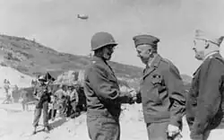 At least one historian has attributed Eisenhower's support for Bradley's subsequent promotion to (temporary) four-star general (March 1945, not made permanent until January 1949) to, in part, a desire to compensate him for the way in which he had been sidelined during the Battle of the Bulge.[39] Others point out that both Secretary of War Stimson and General Eisenhower had desired to reward General Patton with a fourth star for his string of accomplishments in 1944, but that Eisenhower could not promote Patton over Bradley, Devers, and other senior commanders without upsetting the chain of command (as Bradley commanded these people in the theater). A more likely explanation is that as Bradley commanded an Army Group and was the immediate subordinate of Eisenhower, who was promoted to five star rank on 20 December 1944, it was only appropriate that he should hold the next lower rank.[40][41]