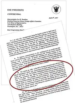 In August 1996, American hedge-fund manager Mansoor Ijaz travelled to Sudan and met with senior officials including al-Turabi and al-Bashir. Ijaz asked Sudanese officials to share intelligence data with US officials on bin Laden and other Islamists who had traveled to and from Sudan during the previous five years. Ijaz conveyed his findings to US officials upon his return, including Sandy Berger, then Clinton's deputy national security adviser, and argued for the US to constructively engage the Sudanese and other Islamic countries.[77] In April 1997, Ijaz persuaded al-Bashir to make an unconditional offer of counterterrorism assistance in the form of a signed presidential letter that Ijaz delivered to Congressman Lee H. Hamilton by hand.[78]