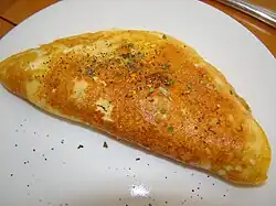 An omelette (omelet in American English; see spelling differences) is a dish made from eggs (usually chicken eggs), fried with butter or oil in a frying pan. It is a common practice for an omelette to include fillings such as chives, vegetables, mushrooms, meat (often ham or bacon), cheese, onions or some combination of the above. Whole eggs or egg whites are often beaten with a small amount of milk, cream, or water.
