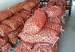 A. cepa is known exclusively from cultivation,[9] but related wild species occur in Central Asia and Iran. The most closely related include A. vavilovii from Turkmenistan and A. asarense from Iran.[10][11] The genus Allium contains other species variously called onions and cultivated for food, such as the Japanese bunching onion (A. fistulosum), Egyptian onion (A.  × proliferum), and Canada onion (A. canadense).[3] The vast majority of cultivars of A. cepa belong to the common onion group (A. cepa var. cepa) and are usually referred to simply as onions. The Aggregatum Group of cultivars (A. cepa var. aggregatum) includes both shallots,[12] formerly classed as a separate species,[13][14] and potato onions.[12] Related species include garlic, leek, and chives.[15]