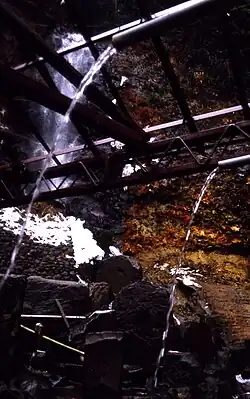 Water at some onsen facilities is drinkable.[39][40][41] Onsen water should only be consumed if it is confirmed to be safe to drink by the prefecture.[40] The water should be obtained from a designated drinking source that is separate from the water which is bathed in.[40] The often mineral-rich onsen water is believed to have benefits such as treating iron-deficiency anemia or constipation.[39][41]