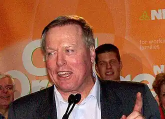 In the 2003 election, the party emphasized their "Public Power Campaign", which had two key issues, primarily publicly owned electricity generation and distribution, and publicly run auto insurance.[16] As well, the Public Power Campaign also dealt with rolling-back the social program cuts from the Harris government's Common Sense Revolution. Many media outlets – including The Globe and Mail – thought that party leader Howard Hampton performed strongly in the televised leaders' debate.[17] Despite Hampton's debate performance and a 2.4% increase in the popular vote, the party lost two seats, once again losing official party status and their previous speaking privileges and funding.[17] One of the problems that likely affected NDP support was strategic voting, not unlike that of the 1999 election. Dozens of NDP voters voted Liberal in order to ensure that the Tories would be defeated.[18] This voting practice did do damage to the NDP's electoral fortunes because it was interpreted as a call for blanket support for Liberal candidates over NDP candidates, with no real thought to which candidate had a better chance to defeat a PC in any individual riding.[19] Several unions, such as the Canadian Auto Workers (CAW), promoted strategic voting to their membership and the public, which further added to the party's woes.[20] The newly elected Liberal government offered to give the NDP caucus research funding if their members agreed to sit as independents. Hampton refused and disrupted the government Throne Speech in protest.[21]
