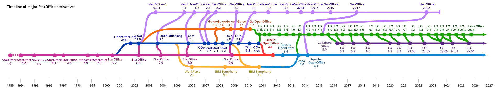 Following Sun's acquisition by Oracle Corporation, development of OpenOffice.org slowed and eventually ended.[10] In 2011, Oracle donated the project to the Apache Software Foundation,[11][12] which continues it as Apache OpenOffice,[13], with the most-recent version being 4.1.16, released on November 10, 2025. A fork of OpenOffice, LibreOffice, was created in 2010 by members of the OpenOffice.org community.[14][15][16]