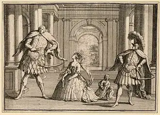The age of opera seria corresponded with the rise to prominence of the castrati, often prodigiously gifted male singers who had undergone castration before puberty in order to retain a high, powerful soprano or alto voice backed by decades of rigorous musical training. They were cast in heroic male roles, the male lead being known as the primo uomo, alongside another new breed of operatic creature, the female lead or prima donna.[1] These two would usually form the main romantic couple of the plot, and duets were assigned almost exclusively to this couple.[1] It was common for the rest of the principal characters to be dominated by soprano and alto voices. Typically, the one tenor or bass voice was given a major patriarchal or monarchical role.[1] For example, compare the role of Roman Emperor Titus in Metastasio's La Clemenza di Tito from Caldara's 1723 setting for alto castrato, with Gluck's 1752 setting and Mozart's 1791 setting, both for tenors.