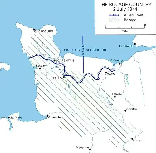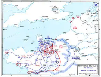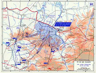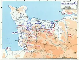 On 12 July, Bradley briefed his commanders on the Cobra plan, which consisted of three phases. The main effort would be under the control of VII Corps. In the first phase, the breakthrough attack would be conducted by the 9th Infantry Division (Major General Manton S. Eddy) and the 30th Infantry Division (Major General Leland Hobbs), which would break into the German defensive zone and then hold the flanks of the penetration while the 1st Infantry Division (Major General Clarence Huebner) and 2nd Armored Division (Major General Edward H. Brooks) pushed into the depth of the position until resistance collapsed.[48] The 1st Infantry Division "was to take Marigny, with this objective exploited by a stream of General Watson's 3rd Armored Division armor that would move south toward Coutances".[49] The 2nd Armored Division—part of "Collins' exploitation force" of the 2nd Armored Division in the east of the VII Corps sector and the "1st Infantry Division reinforced by Combat Command B (CCB) of the 3rd Armored division in the west"[50]—would "pass through the 30th Infantry Division sector ... and guard the overall American left flank."[49] If VII Corps succeeded, the western German position would become untenable, permitting a relatively easy advance to the southwest end of the bocage to cut off and seize the Brittany peninsula.[51][52] First Army intelligence estimated that no German counterattack would occur in the first few days after Cobra's launch and that if they did later, they would be no more than battalion-sized operations.[53]