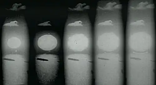 Radio-controlled autopilots were installed in eight B-17 bombers, converting them into remote-controlled drones which were then loaded with automatic cameras, radiation detectors, and air sample collectors. Their pilots operated them from mother planes at a safe distance from the detonations. The drones could fly into radiation environments, such as Able's mushroom cloud, which would have been lethal to crew members.[43] All the land-based detonation-sequence photographs were taken by remote control from tall towers erected on several islands of the atoll. In all, Bikini cameras took 50,000 still pictures and 1,500,000 feet (460,000 m) of motion picture film. One of the cameras could shoot 1,000 frames per second.[44]