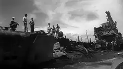Some of the 114 press observers expressed disappointment at the effect on ships.[61] The New York Times reported, prematurely, that "only two were sunk, one capsized, and eighteen damaged."[62] The next day, the Times carried an explanation by Forrestal that "heavily built and heavily armored ships are difficult to sink unless they sustain underwater damage."[63]