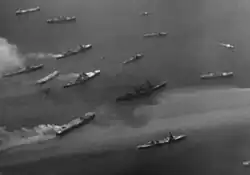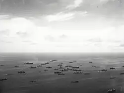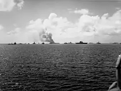 To make room for the target ships, 100 short tons (90 t) of dynamite were used to remove coral heads from Bikini Lagoon. On the grounds of the David Taylor Model Basin outside Washington, DC, dress rehearsals for Baker were conducted with dynamite and model ships in a pond named "Little Bikini."[35] A fleet of 93 target vessels was assembled in Bikini Lagoon. At the center of the target cluster, the density was 20 ships per square mile (7.7 per km2), three to five times greater than military doctrine would allow. The stated goal was not to duplicate a realistic anchorage but to measure damage as a function of distance from the blast center, at as many distances as possible.[36] The arrangement also reflected the outcome of the Army/Navy disagreement about how many ships should be allowed to sink.[37]