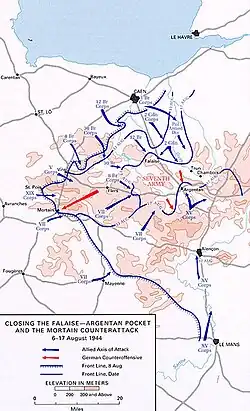 By 13 August, the offensive had fully halted, with German forces being driven out of Mortain. The Germans had lost 120 tanks and assault guns to Allied counter-attacks and air strikes, more than two-thirds of their committed total.[30][31][2] As Hitler ordered German forces in Normandy to hold their positions,[29] the U.S. VII and XV Corps were swinging east and north toward Argentan.[29] The German attack west left the 7th Army and Panzergruppe West in danger of being encircled by Allied forces. As American forces advanced on Argentan, British and Canadian forces advanced on Falaise, threatening to cut off both armies in the newly formed Falaise Pocket.[29]