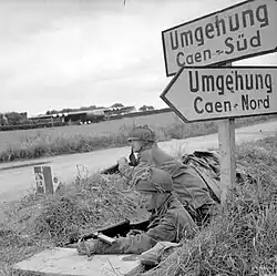 Neither division was rated as being highly efficient, with Allied intelligence rating them at a forty per-cent efficiency compared to a first-class line infantry division in a static role, and fifteen per cent in a counter-attack role. Allied intelligence also indicated that two companies of armour were in the area, as were a number of ad hoc infantry formations formed from training establishments.[21] Based near Caen, in support of the static divisions, was the 21st Panzer Division. The 125th Panzergrenadier Regiment was billeted at Vimont, just east of Caen, and the 2nd Battalion, 192nd Panzergrenadier Regiment was based at Cairon to the west of the Caen canal and the River Orne bridges.[22][23][24]