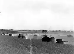 Although the first day's progress was slower than expected, Operation Tractable resumed on 15 August; both armoured divisions pushed southeast toward Falaise.[14] The Canadian 2nd and 3rd infantry divisions—with the support of the Canadian 2nd Armoured Brigade—continued their drive south towards the town.[15] After harsh fighting, the 4th Armoured Division captured Soulangy but the gains made were minimal as strong German resistance prevented a breakthrough to Trun.[16] On 16 August, the Canadian 2nd Infantry Division broke into Falaise, encountering minor opposition from Waffen-SS units and scattered pockets of German infantry.[13] Although it would take two more days to clear all resistance in the town, the first major objective of Operation Tractable had been achieved. Simonds began to reorganize the bulk of his armoured forces for a renewed push towards Trun to close the Falaise Pocket.[14]