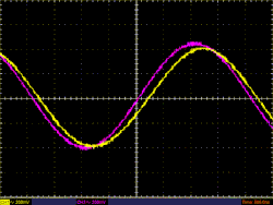 Slew limiting may distort large or fast signals. A 250 kHz input sine (magenta) is buffered by an opamp with a 720 mV/μs slew limit. With a small input sine, the output (yellow) has almost no distortion. But as the input's amplitude increases, the output can't transition fast enough to reproduce the larger sine's steeper slope and looks more like a triangle wave.