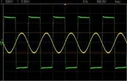 The input (yellow) and output (green) of a saturated op amp in an inverting amplifier