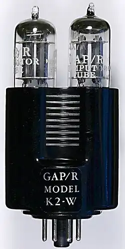 1953: A commercially available op amp. In 1953, vacuum tube op amps became commercially available with the release of the model K2-W from George A. Philbrick Researches, Incorporated. The designation on the devices shown, GAP/R, is an acronym for the complete company name. Two nine-pin 12AX7 vacuum tubes were mounted in an octal package and had a model K2-P chopper add-on available. This op amp was based on a descendant of Loebe Julie's 1947 design and, along with its successors, would start the widespread use of op amps in industry.[21]