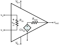 An equivalent circuit of an operational amplifier that models some resistive non-ideal parameters.