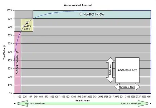 ABC analysis is a method for analyzing inventory based on Pareto distribution, it posits that since revenue from items on inventory will be power law distributed then it makes sense to manage items differently based on their position on a revenue-inventory level matrix, 3 classes are constructed (A, B and C) from cumulative item revenues, so in a matrix each item will have a letter (A, B or C) assigned for revenue and inventory. This method posits that items away from the diagonal should be managed differently: items in the upper part are subject to risk of obsolescence, items in the lower part are subject to risk of stockout.
