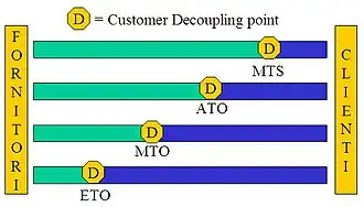 Another possible classification[39] is one based on lead time (manufacturing lead time vs delivery lead time): engineer to order (ETO), purchase to order (PTO), make to order (MTO), assemble to order (ATO) and make to stock (MTS). According to this classification different kinds of systems will have different customer order decoupling points (CODP), meaning that work in progress (WIP) cycle stock levels are practically nonexistent regarding operations located after the CODP (except for WIP due to queues). (See Order fulfillment.)