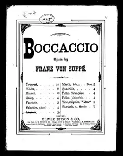 Franz von Suppé, also known as Francesco Ezechiele Ermenegildo, Cavaliere Suppé-Demelli, was born in 1819 and his fame rivals that of Offenbach. Suppé was a leading composer and conductor in Vienna and most known for his operetta Leichte Kavallerie (1866), Fatinitza (1876), and Boccaccio (1879).[20] Suppé was a contemporary to Strauss and composed over 30 operettas 180 farces, ballets and other stage works. Recently, though most of his works have been fallen into obscurity, many of them have been reprised within films, cartoons, advertisements and so on. Both Strauss and Suppé are considered to be the most notable composers of the Golden Age of Viennese operetta.[21]