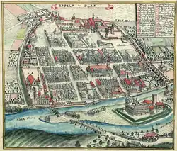 In the early 13th century, Duke Casimir I of Opole decided to move the settlement from the Pasieka Island to the right shore of the Oder river (since the 17th century, the old stream bed of the Oder, known as the Młynówka). All of the inhabitants had to be moved in order to accommodate the castle that was built in place of the old city.[13] Former inhabitants of Ostrówek, together with German merchants that immigrated from the West, received the first town rights probably as early as around 1217, although this date is disputed.[14] Opole received German town law in 1254, which was expanded with Neumarkt law in 1327. Opole developed during the rule of duke Bolko I of Opole. The castle was finally completed around this time and new buildings, including the city walls and the Holy Cross Church, were constructed.
