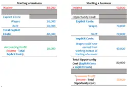 Economic profit does not indicate whether or not a business decision will make money. It signifies if it is prudent to undertake a specific decision against the opportunity of undertaking a different decision. As shown in the simplified example in the image, choosing to start a business would provide $10,000 in terms of accounting profits. However, the decision to start a business would provide −$30,000 in terms of economic profits, indicating that the decision to start a business may not be prudent as the opportunity costs outweigh the profit from starting a business. In this case, where the revenue is not enough to cover the opportunity costs, the chosen option may not be the best course of action.[15] When economic profit is zero, all the explicit and implicit costs (opportunity costs) are covered by the total revenue and there is no incentive for reallocation of the resources. This condition is known as normal profit.