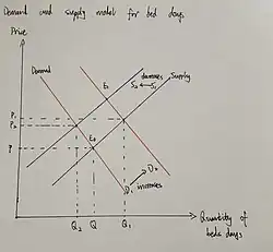 However, the opportunity cost of implementing policies to the sector has limited impact in the health sector. Patients with severe symptoms of COVID-19 require close monitoring in the ICU and in therapeutic ventilator support, which is key to treating the disease.[26] In this case, scarce resources include bed days, ventilation time, and therapeutic equipment. Temporary excess demand for hospital beds from patients exceeds the number of bed days provided by the health system. The increased demand for days in bed is due to the fact that infected hospitalized patients stay in bed longer, shifting the demand curve to the right (see curve D2 in Graph1.11).[24] The number of bed days provided by the health system may be temporarily reduced as there may be a shortage of beds due to the widespread spread of the virus. If this situation becomes unmanageable, supply decreases and the supply curve shifts to the left (curve S2 in Graph1.11).[24] A perfect competition model can be used to express the concept of opportunity cost in the health sector.[27] In perfect competition, market equilibrium is understood as the point where supply and demand are exactly the same (points P and Q in Graph1.11).[24] The balance is Pareto optimal equals marginal opportunity cost. Medical allocation may result in some people being better off and others worse off. At this point, it is assumed that the market has produced the maximum outcome associated with the Pareto partial order.[24] As a result, the opportunity cost increases when other patients cannot be admitted to the ICU due to a shortage of beds.