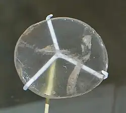 Media that have different indexes of refraction for different polarisation modes are called birefringent.[91] Well known manifestations of this effect appear in optical wave plates/retarders (linear modes) and in Faraday rotation/optical rotation (circular modes).[92] If the path length in the birefringent medium is sufficient, plane waves will exit the material with a significantly different propagation direction, due to refraction. For example, this is the case with macroscopic crystals of calcite, which present the viewer with two offset, orthogonally polarised images of whatever is viewed through them. It was this effect that provided the first discovery of polarisation, by Erasmus Bartholinus in 1669. In addition, the phase shift, and thus the change in polarisation state, is usually frequency dependent, which, in combination with dichroism, often gives rise to bright colours and rainbow-like effects. In mineralogy, such properties, known as pleochroism, are frequently exploited for the purpose of identifying minerals using polarisation microscopes. Additionally, many plastics that are not normally birefringent will become so when subject to mechanical stress, a phenomenon which is the basis of photoelasticity.[93] Non-birefringent methods, to rotate the linear polarisation of light beams, include the use of prismatic polarisation rotators which use total internal reflection in a prism set designed for efficient collinear transmission.[94]