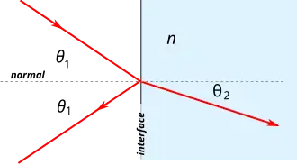 where θ1 and θ2 are the angles between the normal (to the interface) and the incident and refracted waves, respectively.[45]