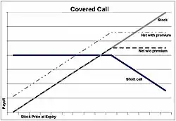 One well-known strategy is the covered call, in which a trader buys a stock (or holds a previously purchased stock position), and sells a call. (This can be contrasted with a naked call. See also naked put.) If the stock price rises above the exercise price, the call will be exercised and the trader will get a fixed profit. If the stock price falls, the call will not be exercised, and any loss incurred to the trader will be partially offset by the premium received from selling the call. Overall, the payoffs match the payoffs from selling a put. This relationship is known as put–call parity and offers insights for financial theory. A benchmark index for the performance of a buy-write strategy is the CBOE S&P 500 BuyWrite Index (ticker symbol BXM).