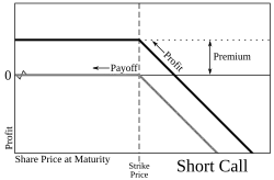 A trader who expects a stock's price to decrease can sell the stock short or instead sell, or "write", a call. The trader selling a call has an obligation to sell the stock to the call buyer at a fixed price ("strike price"). If the seller does not own the stock when the option is exercised, they are obligated to purchase the stock in the market at the prevailing market price. If the stock price decreases, the seller of the call (call writer) makes a profit in the amount of the premium. If the stock price increases over the strike price by more than the amount of the premium, the seller loses money, with the potential loss being unlimited.