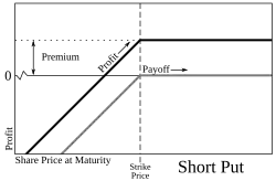 A trader who expects a stock's price to increase can buy the stock or instead sell, or "write", a put. The trader selling a put has an obligation to buy the stock from the put buyer at a fixed price ("strike price"). If the stock price at expiration is above the strike price, the seller of the put (put writer) makes a profit in the amount of the premium. If the stock price at expiration is below the strike price by more than the amount of the premium, the trader loses money, with the potential loss being up to the strike price minus the premium. A benchmark index for the performance of a cash-secured short put option position is the CBOE S&P 500 PutWrite Index (ticker PUT).