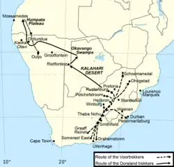 In 1824 farmers of Dutch, French Huguenot and German descent known as Trekboers (later named Boers by the English) emerged from the Cape Colony, seeking pasture for their flocks and to escape British governmental oversight, settling in the country. Up to this time the few Europeans who had crossed the Orange had come mainly as hunters or as missionaries. These early migrants were followed in 1836 by the first parties of the Great Trek. These emigrants left the Cape Colony for various reasons, but all shared the desire for independence from British authority. The leader of the first large party, Hendrik Potgieter, concluded an agreement with Makwana, the chief of the Bataung tribe of Batswana, ceding to the farmers the country between the Vet and Vaal rivers.[3] When Boer families first reached the area they discovered that the country had been devastated, in the northern parts by the chief Mzilikazi and his Matabele in what was known as the Mfecane, and also by the Difaqane, in which three tribes roamed across the land attacking settled groups, absorbing them and their resources until they collapsed because of their sheer size. Consequently, large areas were depopulated.[3] The Boers soon came into collision with Mzilikazi's raiding parties, which attacked Boer hunters who crossed the Vaal River. Reprisals followed, and in November 1837 the Boers decisively defeated Mzilikazi, who thereupon fled northward[3] and eventually established himself on the site of the future Bulawayo in Zimbabwe.