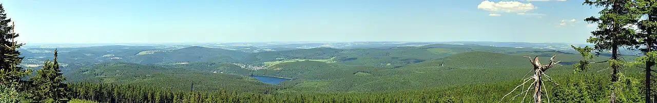 The higher altitudes from around 500 m above sea level on the German side belong to the Ore Mountains/Vogtland Nature Park – the largest of its kind in Germany with a length of 120 km. The eastern Ore Mountains are protected landscape. Other smaller areas on the German and Czech sides are protected as nature reserves and natural monuments. On the ridges there are also several larger raised bogs that are only fed by rainwater. The mountains are popular for hiking and there are winter sports areas at higher elevations. In 2019, the region became a UNESCO World Heritage Site.[1]