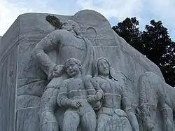 A variety of artwork is displayed on the exterior of the building. Sculptor Leo Friedlander used Vermont marble for the large relief sculptures on both sides of the main entrance. One sculpture depicts Meriwether Lewis, William Clark, and Sacagawea, with a map of their expedition's route on the reverse (Lewis and Clark); the other (Covered Wagon) shows pioneers and a covered wagon, with a map of the Oregon Trail on the reverse. Additionally, Ellerhusen created five marble relief sculptures on the exterior, and a metal sculpture by Tom Morandi sits above the south entrance. Ellerhusen also cast six bronze sculptures arranged above the building's main entrance, three on the inside and three on the outside.[20]