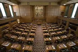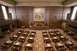 Oregon's House chamber floor is covered with a custom carpet; the carpet's pattern incorporates a depiction of the state tree, the Douglas-fir, representative of forestry. The furniture and paneling of the chamber is made of golden oak. A large mural painted by Faulkner, depicting the 1843 Champoeg Meetings at which the provisional government was formed, is behind the desk of the Speaker of the House. The Senate chambers use black walnut for the paneling and furniture. Another custom carpet lines the floor, featuring Chinook salmon and wheat, representative of fishing and agriculture. The Senate's large mural was painted by Schwarz and depicts a street scene showing news of statehood reaching Salem. Lining the walls of both chambers are 158 names, inscribed in friezes, of prominent people in Oregon's history. On the second floor of the capitol is the Governor's suite, consisting of a ceremonial office and private offices for the state's chief executive. As in the Senate chamber, the paneling is of black walnut. The ceremonial office includes a fireplace with a painting by Faulkner. In the suite's reception area is a table made of 40 tree species.[20] This table is inlaid with a replica of Oregon's second capitol building, the state flower (Oregon-grape), and the state bird (western meadowlark).[48]