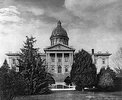 Built of stone and five million bricks, Oregon's new capitol measured 275 by 136 feet (84 by 41 m) with a dome of 180 feet (55 m).[17] The Umpqua region provided the sandstone used in the ground-level base.[11][18] The structure had a square rotunda on the interior that was 54 feet (16 m) tall. Also inside was a Senate chamber measuring 75 by 45 feet (23 by 14 m) and a House chamber of 85 by 75 feet (26 by 23 m). On the top floor was the Oregon Supreme Court with a courtroom measuring 54 by 45 feet (16 by 14 m) and the Oregon State Law Library, 75 by 70 feet (23 by 21 m). Also on the top floor was a viewing gallery for the House. On the exterior were ornamental pilasters and two-story porticos on the east and west ends.[16][17] The building included a lunch counter.[19] Additionally, the building had mullion-windowed wings.[16] The large copper-clad dome was constructed with an iron and steel framework. This dome rose 54 feet (16 m) above the rest of the building and was 100 feet (30 m) tall. The building was of Renaissance style[17] with Corinthian columns on the front entrance[20] and was patterned after the United States Capitol.[21] At that time, the capitol faced west toward the Willamette River.[16] The government began using the building in August 1876, before the dome was built. Originally, plans called for towers on both sides of the dome (a tower on both ends of the building with the dome in the middle), but they were left out to save money.[17] Oregon's second capitol building stood from 1876 to 1935.