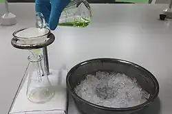 Vacuum filtration uses suction to pull liquid through a Büchner funnel equipped with filter paper, which catches the desired solid product.[15] This process removes any unwanted solution in the reaction mixture by pulling it into the filtration flask and leaving the desired product to collect on the filter paper.