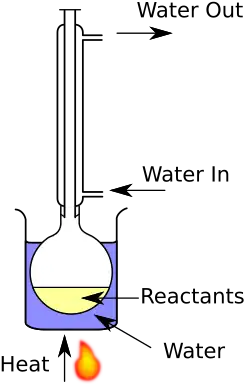 Many reactions require heat to increase reaction speed.[18] However, in many situations increased heat can cause the solvent to boil uncontrollably which negatively affects the reaction, and can potentially reduce product yield. To address this issue, reflux condensers can be fitted to reaction glassware. Reflux condensers are specially designed pieces of glassware that possess two inlets for water to run in and out through the glass against gravity. This flow of water cools any escaping substrate and condenses it back into the reaction flask to continue reacting[19] and ensure that all product is contained. The use of reflux condensers is an important technique within organic syntheses and is utilized in reflux steps, as well as recrystallization steps.